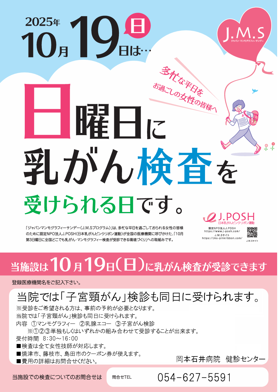 岡本石井病院(関連病院)にて10月19日(日)に乳がん・子宮がん検診を受けられます。